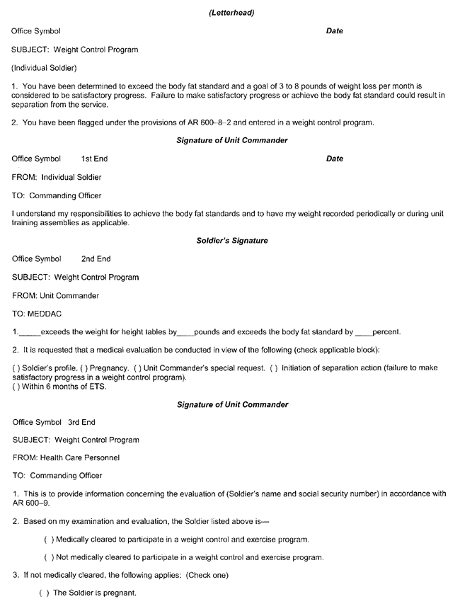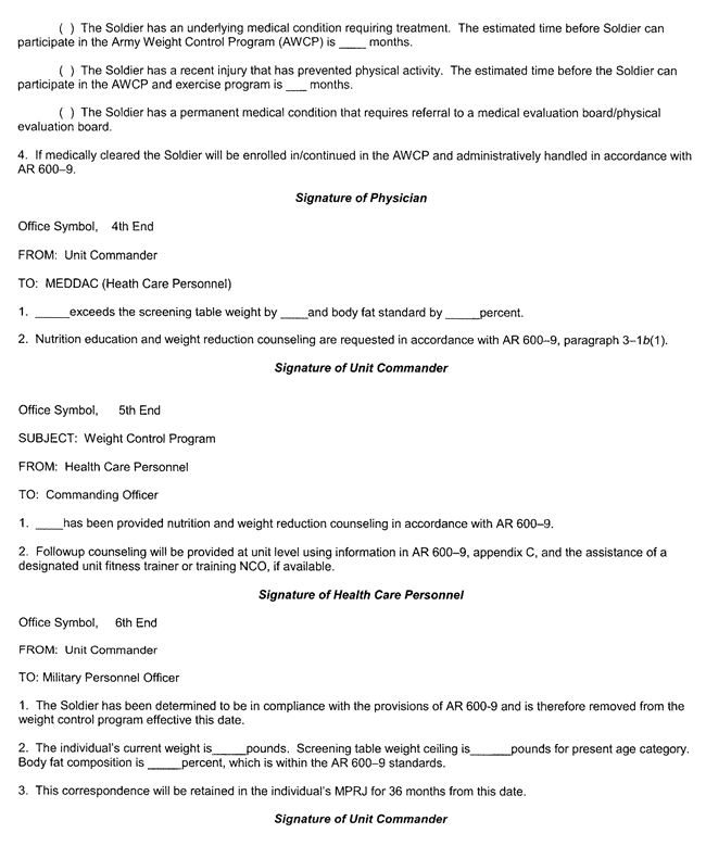 (4) The sample correspondence shown in figure 3–1 will be completed and retained by the unit commander or supervisor to properly document recommendations and actions taken in each case. The use of certain medications to treat an underlying medical disorder or the inability to perform all aerobic events may contribute to weight gain but are not considered sufficient justification for noncompliance with this regulation. If an individual’s weight condition, as diagnosed by medical authorities, results from an underlying or associated disease process, health care personnel will take one of the following actions: