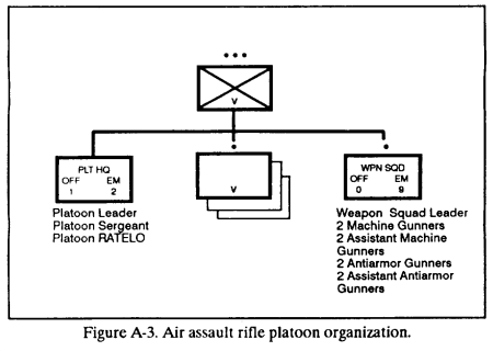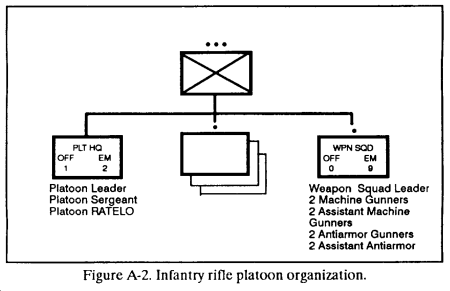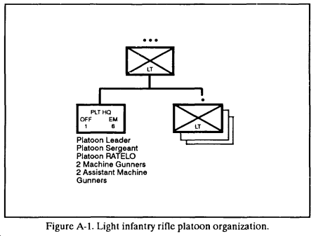a. The light infantry rifle platoon consists of three rifle squads and a platoon headquarters with two machine gun teams (Figure A-1). Each machine gun team consists of two men–a machine gunner and an assistant machine gunner.