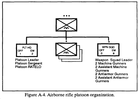 b. The infantry, air assault, and airborne rifle platoons consist of a platoon headquarters, three rifle squads, and a weapons squad ( Figures A-2 through A-4 ). There are two machine gun teams and two antiarmor teams in the weapons squad. Each machine gun team and antiarmor team consists of two men–a gunner and an assistant gunner.