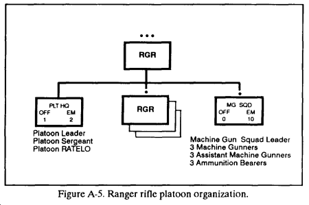 c. The ranger rifle platoon consists of a platoon headquarters, three rifle squads, and a machine gun squad (Figure A-5). There are three machine gun crews in the machine gun squad. Each machine gun crew consists of three men–a machine gunner, an assistant machine gunner, and an ammunition bearer.