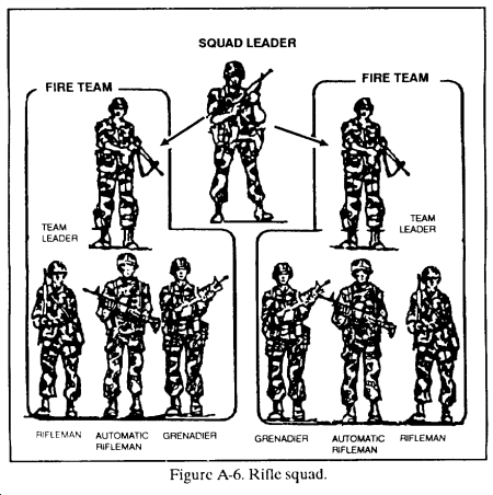 The most common rifle squad has nine soldiers (Figure A-6). It fights as two fire teams. The squad has one squad leader, two fire team leaders, two automatic riflemen, two riflemen, and two grenadiers.