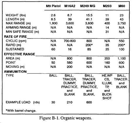Supporting weapons provide the platoon and squad leaders additional firepower. They must know how to effectively integrate the fires of these weapons with the fires of their organic weapons. See Figures B-4 through B-7.
