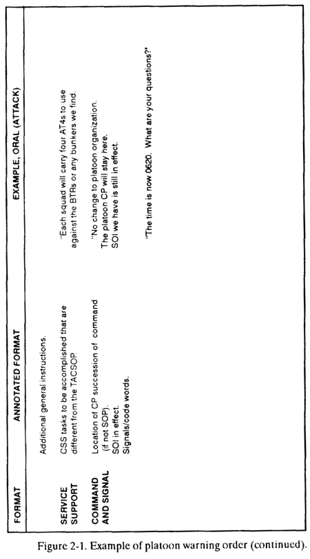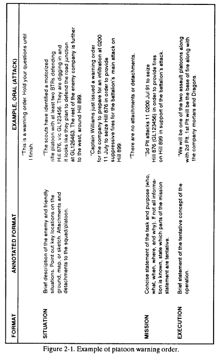 b. STEP 2. Issue a Warning Order. The leader provides initial instructions in a warning order. The warning order contains enough information to begin preparation as soon as possible. Platoon SOPs should prescribe who will attend all warning orders and the actions they must take upon receipt: for example, drawing ammunition, rations and water, and checking communications equipment. The warning order has no specific format. One technique is to use the five-paragraph OPORD format. The leader issues the warning order with all the information he has available at the time. He provides updates as often as necessary. The leader never waits for information to fill a format. A sample warning order is in Figure 2-1. If available, the following information may be included in a warning order.