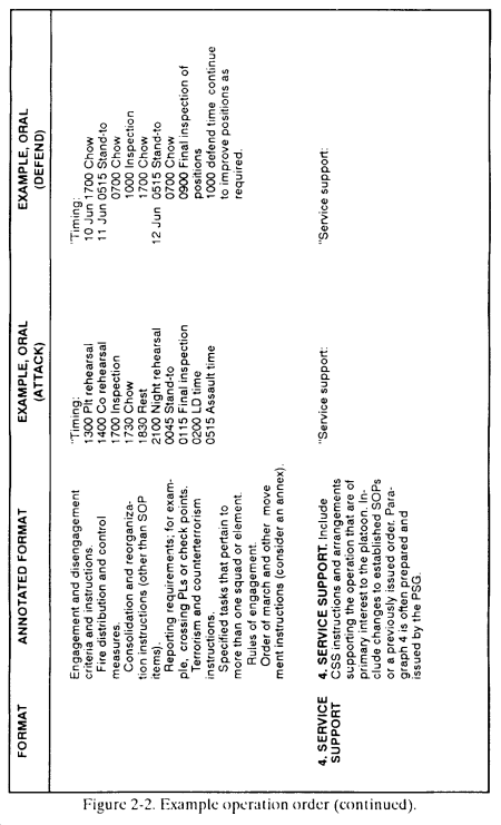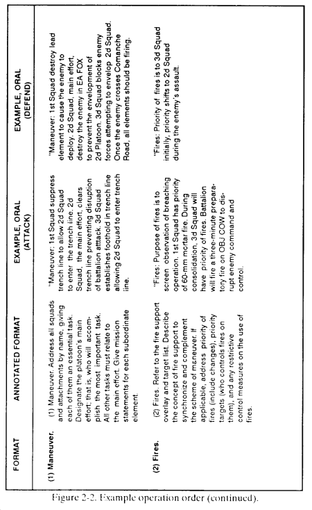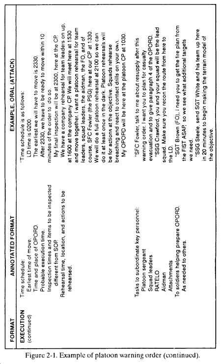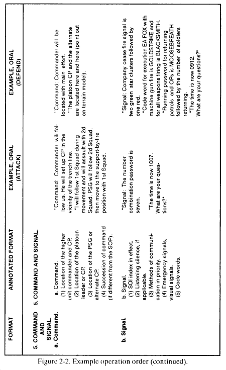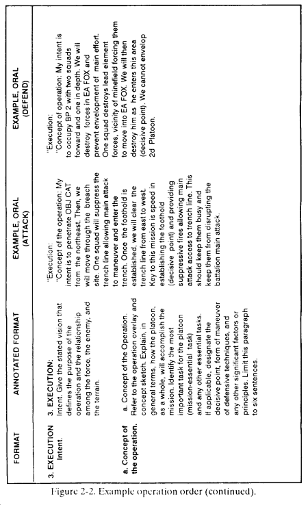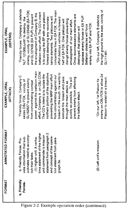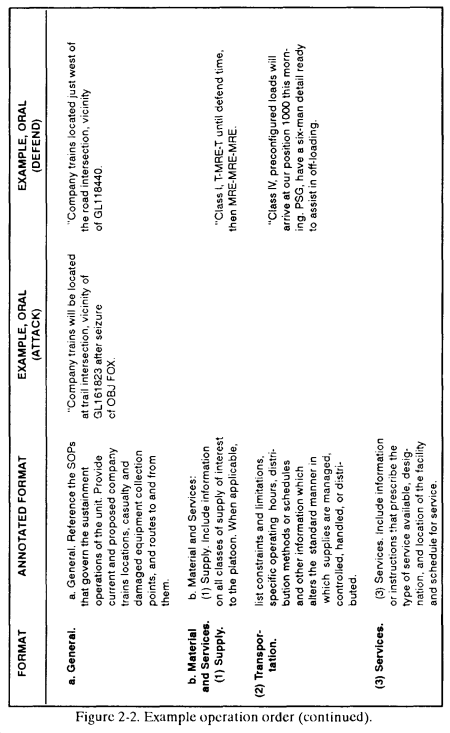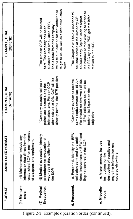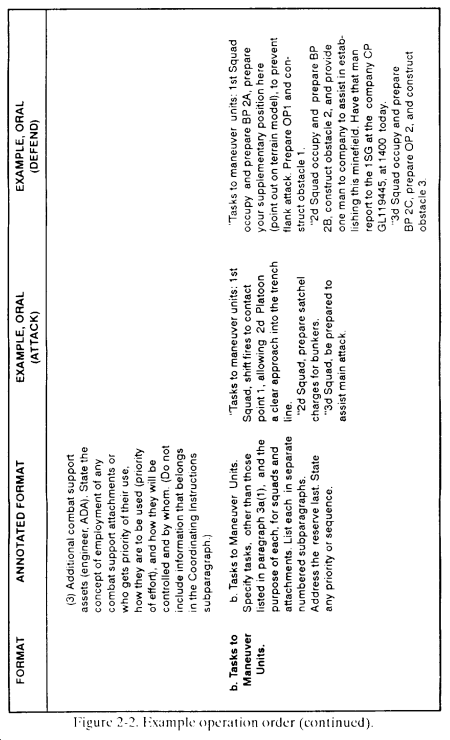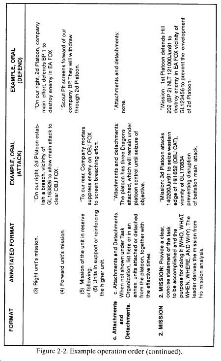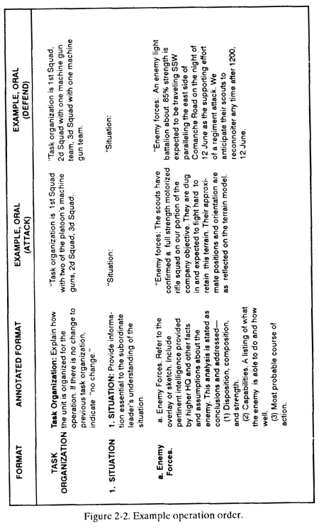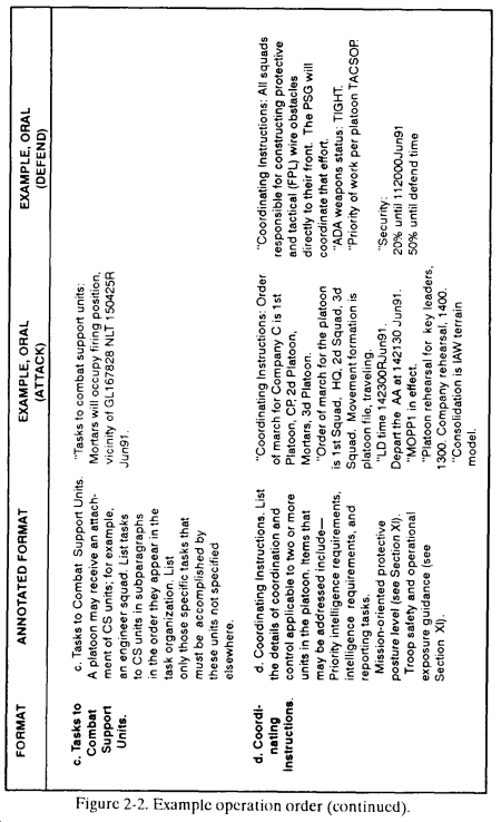 a. The leader briefs his OPORD orally from notes that follow the five-paragraph format below ( Figure 2-2 ).