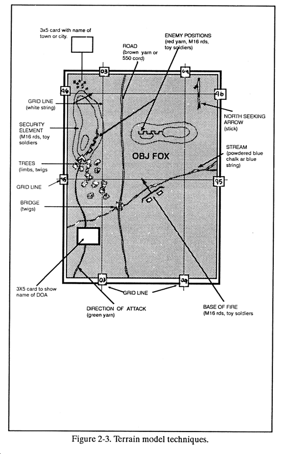 (2) Terrain model. A terrain model is a three-dimensional scale model of the terrain (Figure 2-3). It is effective for briefing and discussing the actions on the objective. It may depict the entire mission area. However, for offense missions, priority should be given to building a model of the objective area.