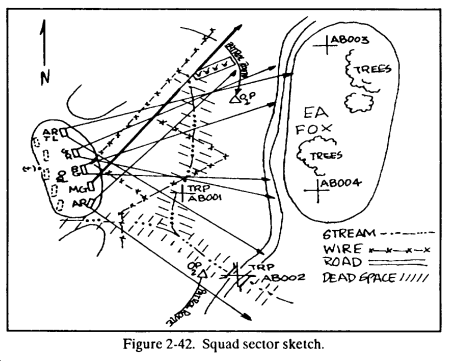 (1) Concept sketch. The sketch shows the locations and positions of objectives, control measures, and key terrain in relation to each other. It is not necessarily drawn to scale.