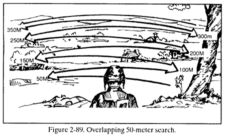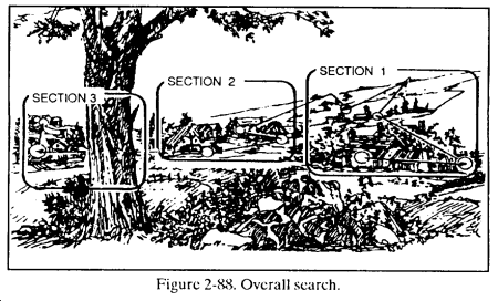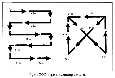 a. Night Vision Scanning. Dark adaptation is only the first step toward making the greatest use of night vision. Scanning enables soldiers to overcome many of the physiological limitations of their eyes. It can also reduce confusing visual illusions. This technique involves looking from right to left or left to right using a slow, regular scanning movement (Figure 2-92). At night, it is essential to avoid looking directly at a faintly visible object when trying to confirm its presence.