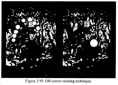 b. Use of Off-Center Vision. The technique of viewing an object using central vision is ineffective at night. This is due to the night blind spot that exists during low illumination. Soldiers must learn to use off-center vision. This technique requires viewing an object by looking 10 degrees above, below, or to either side of it rather than directly at it (Figure 2-93).